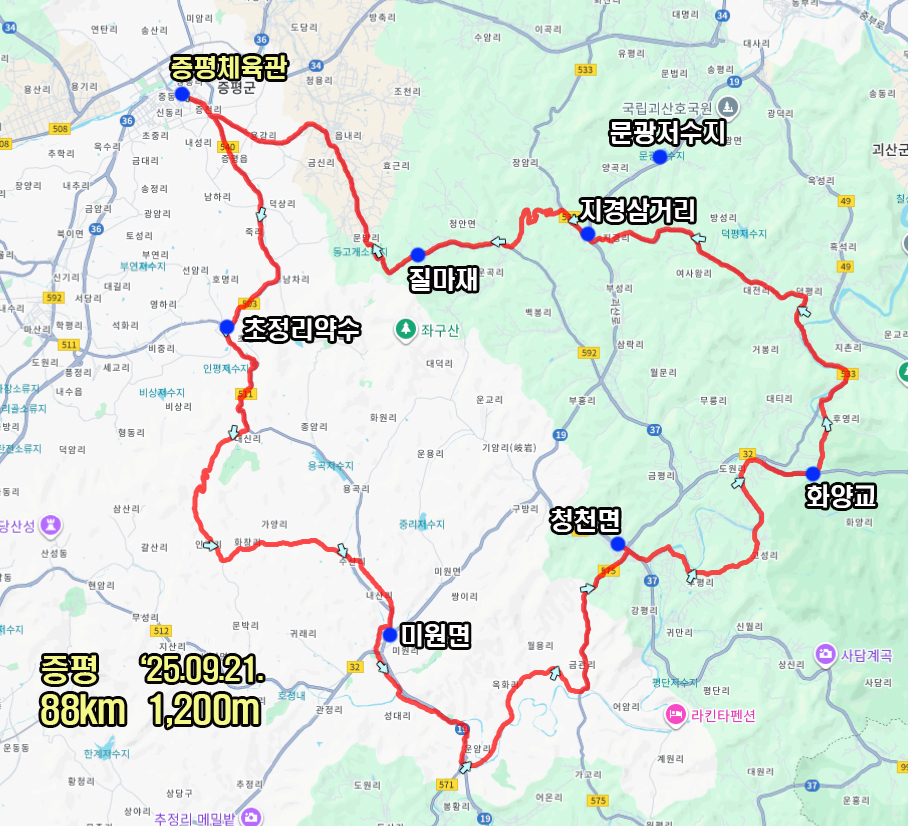 증평에서 출발해서 청주와 괴산방향으로 한바퀴 돌아오는 88km 1,200m의 코스입니다.